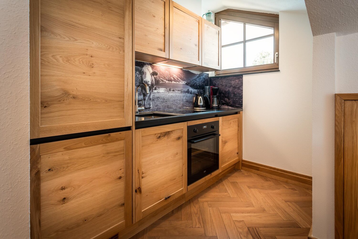 Holzküche mit Schränken, Arbeitsplatte, Ofen und Esstisch.