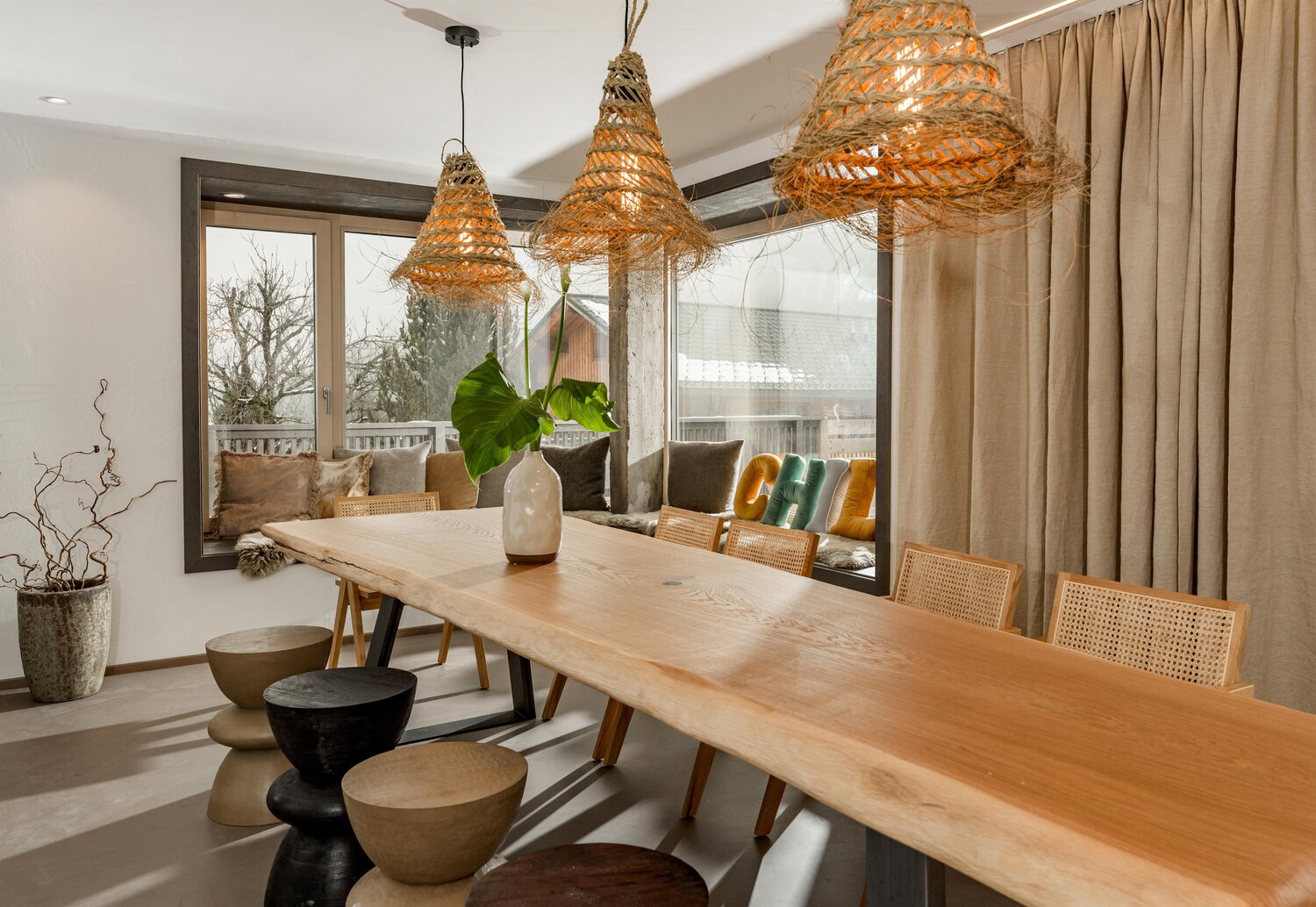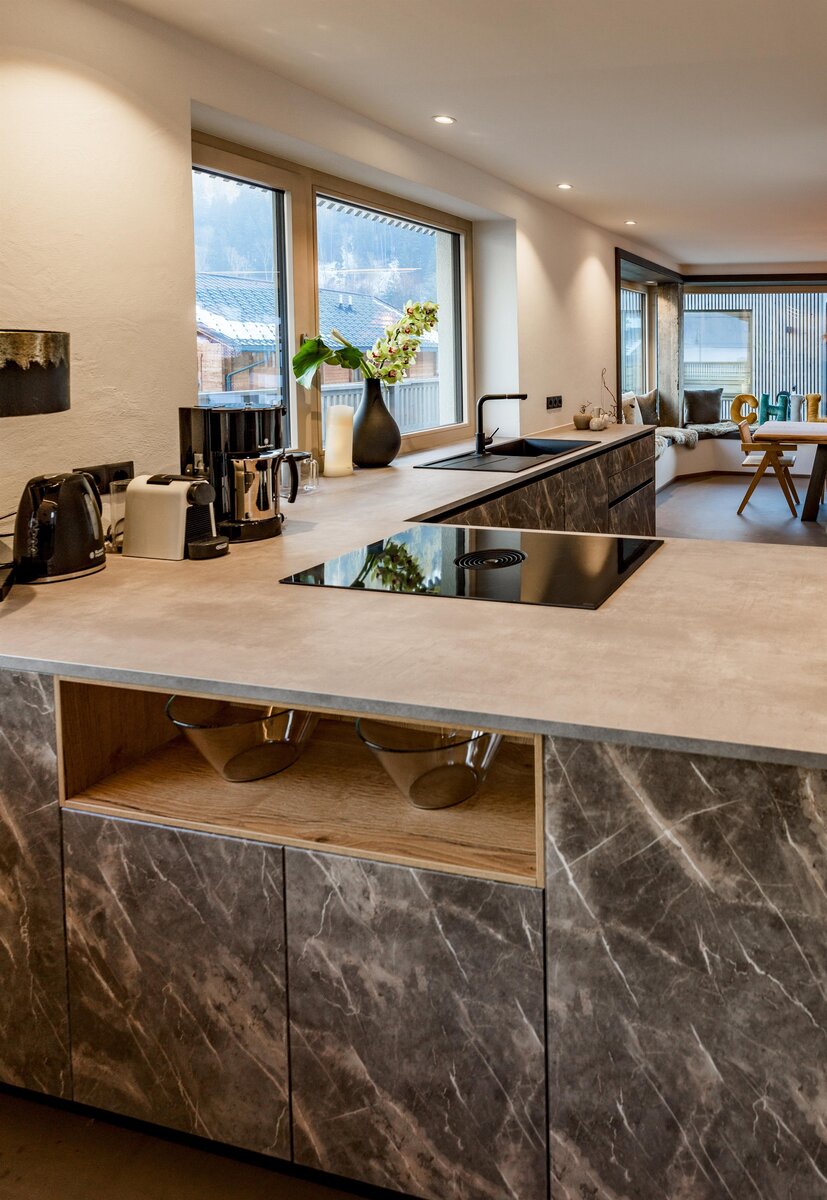 • Eat & Meet & Chill Area mit komplett ausgestatteter Küche, großer Esstisch, XXL Couch, Kachelofen, Medientisch und Smart TV
