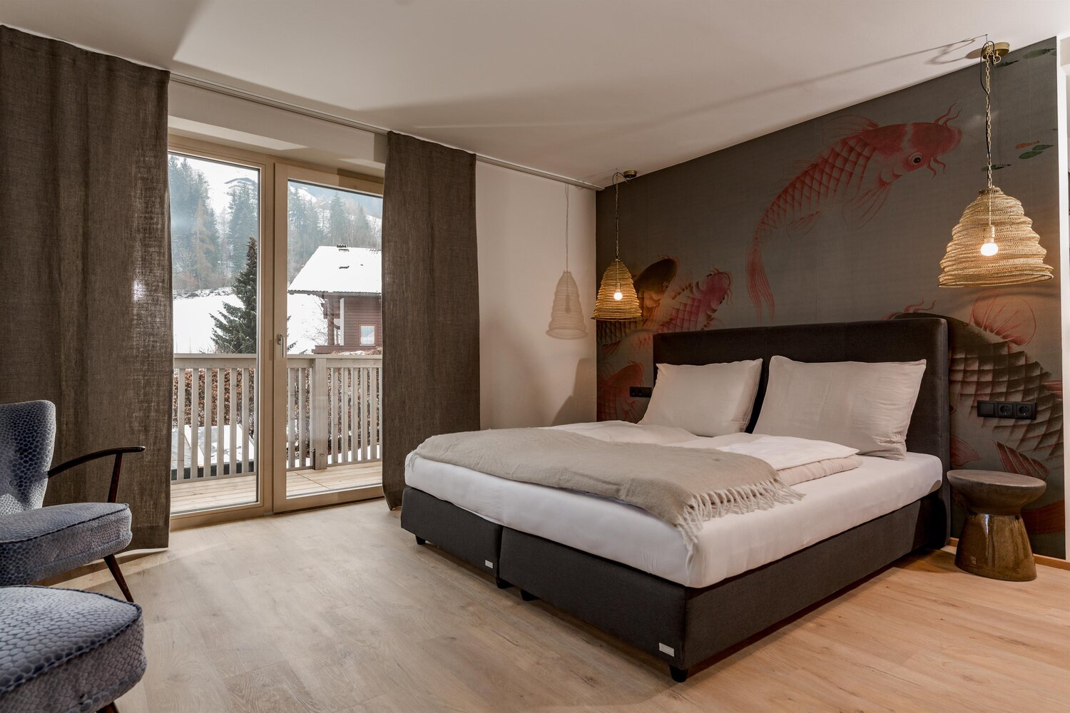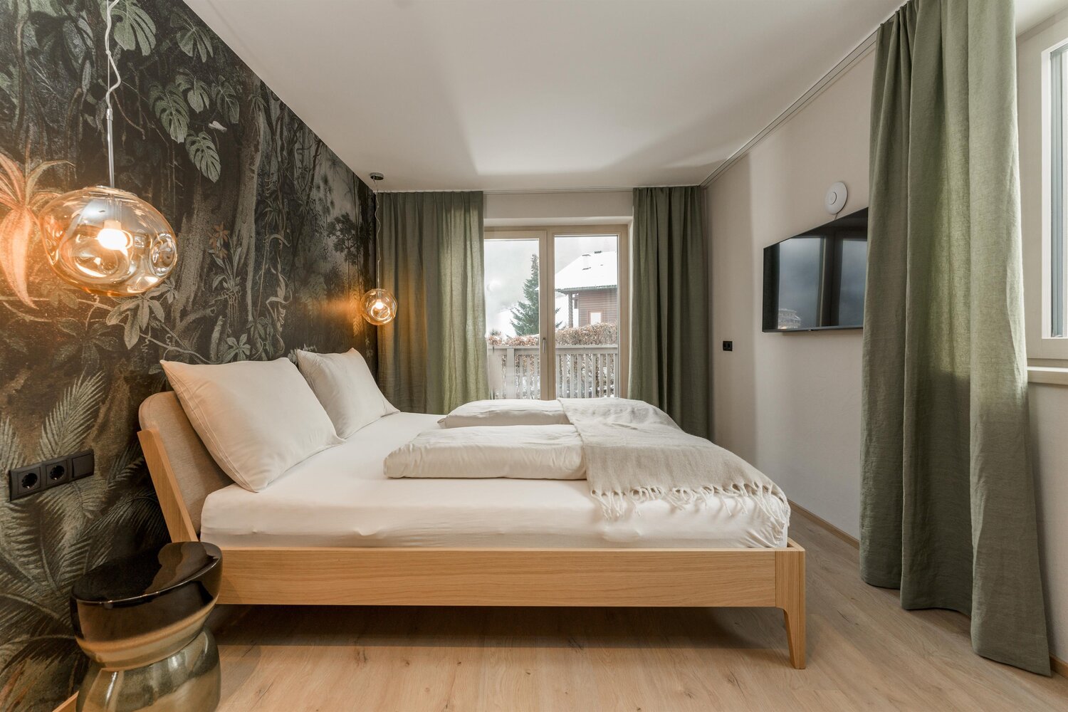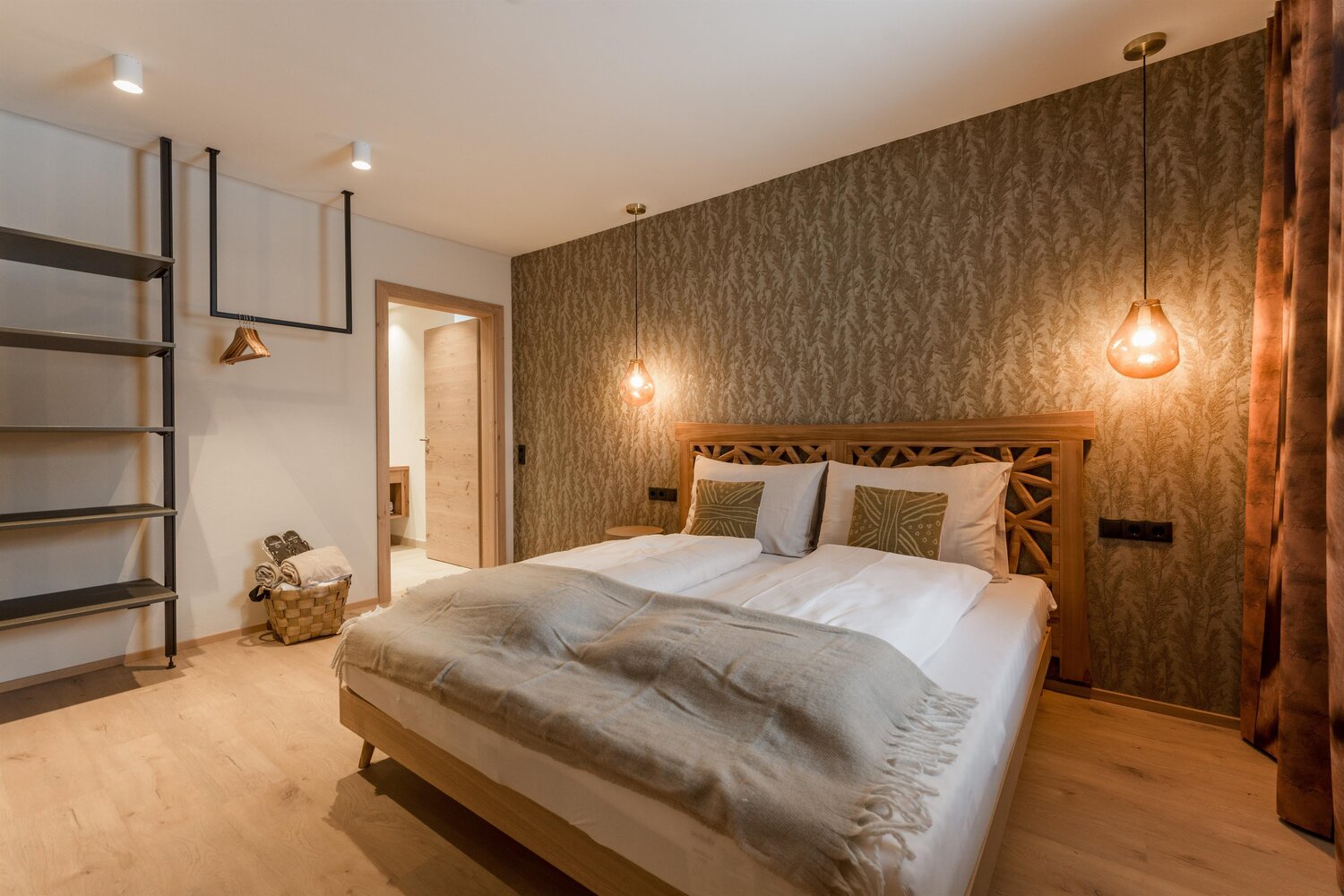 Massives Holzbett mit Pendelleuchten und gemusterter Tapete
