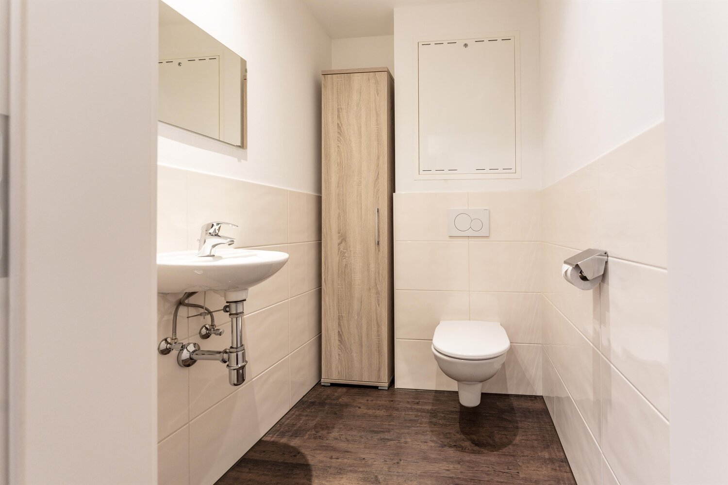 • 1 bathroom with double washbasin, bathtub and shower, WC