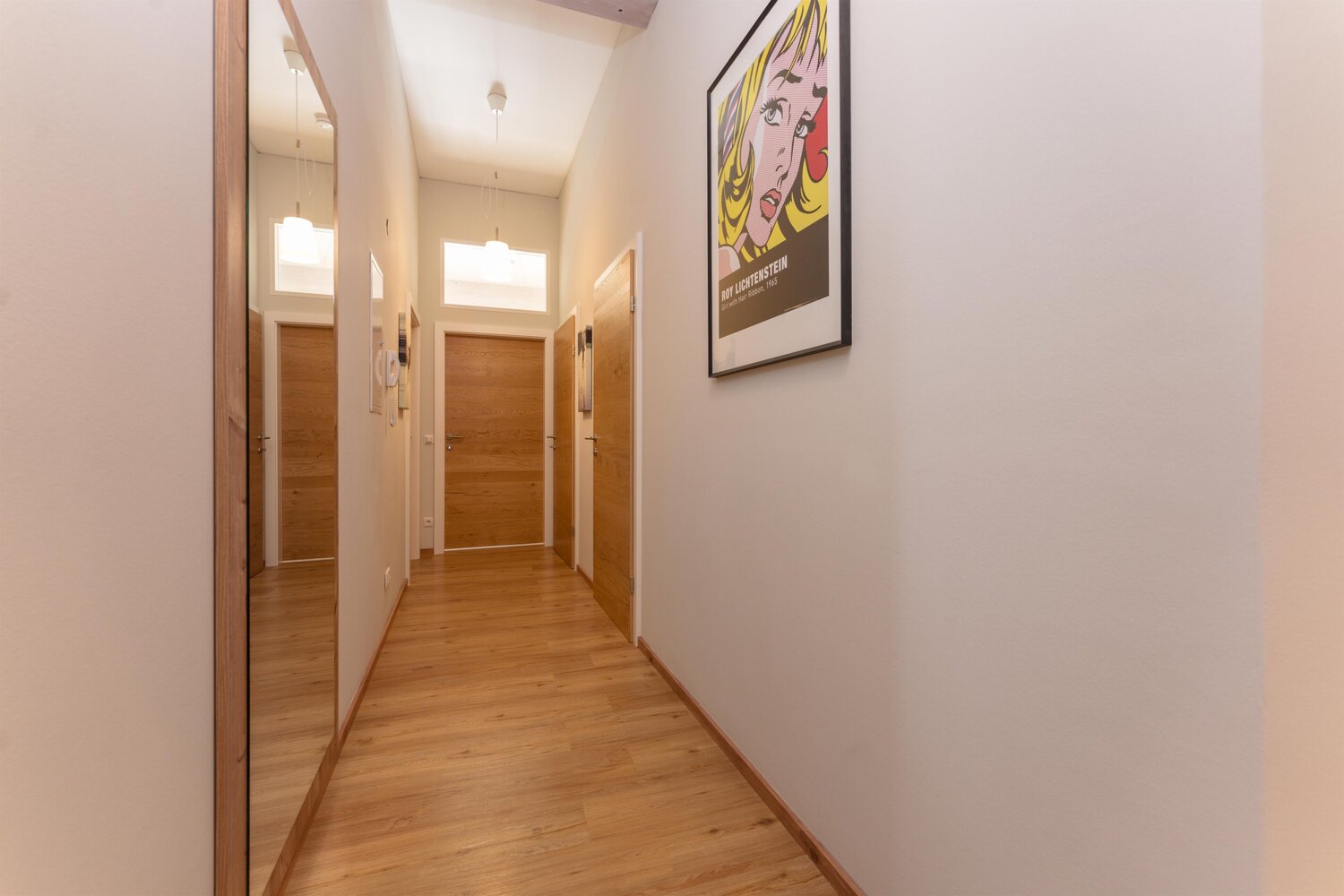 The high ceilings and sloping roof create a cozy atmosphere, while the south-facing balcony offers a wonderful view of the surroundings. Restaurants, bars, and shops are just minutes away, so you can confidently leave your car behind.