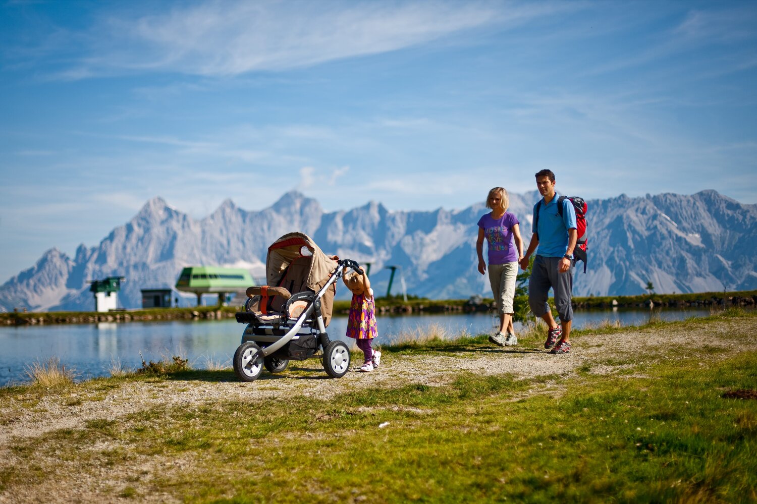 Easy-to-walk paths like the Tree Horoscope Path in Rohrmoos, the Lake Constance Circular Path, parts of the Wild Water Path (via the forest path to the Riesachsee), as well as many themed paths on the Planai and Reiteralm are also easily manageable with a stroller.
